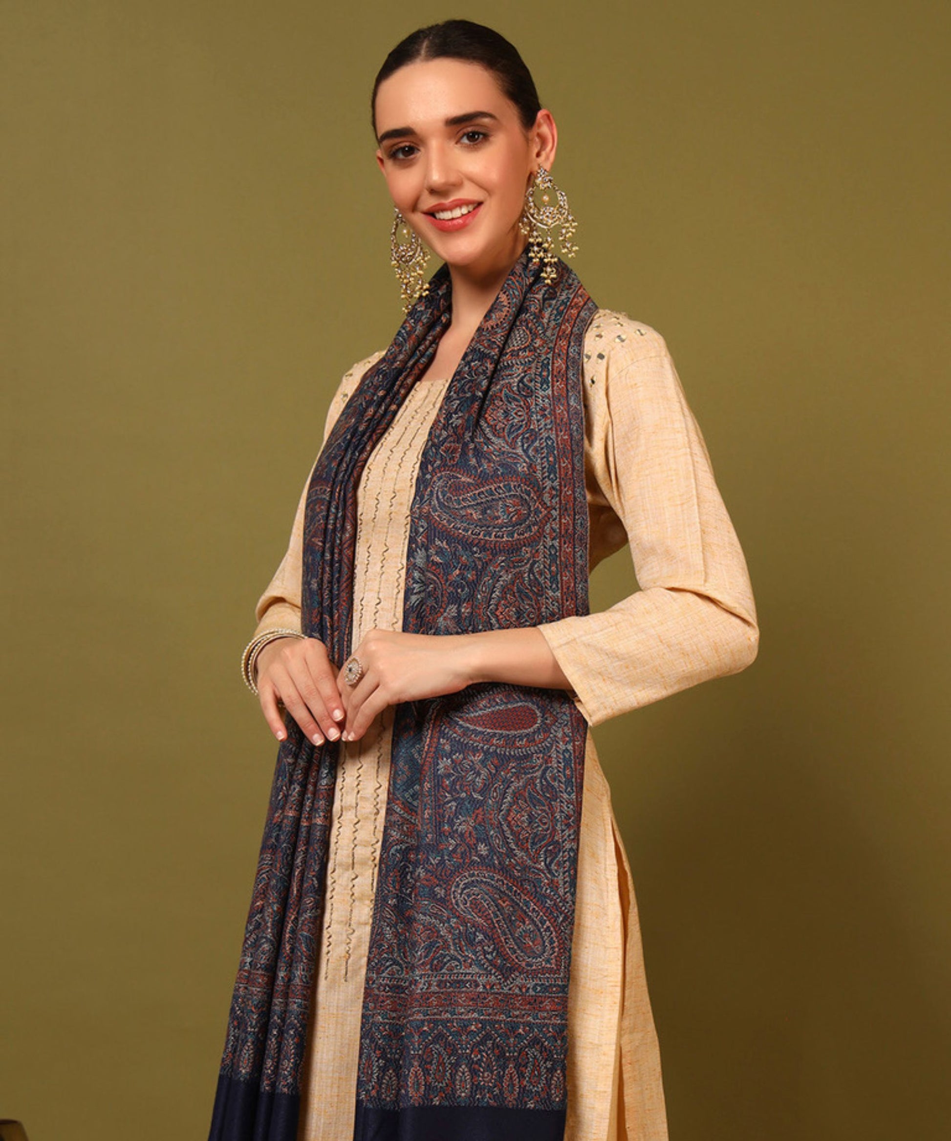 Experience luxurious softness with this super fine Jacquard faux pashmina shawl. Crafted from premium blended wool, it features an elegant Jacquard weave and a rich navy tone—perfect for winter styling, festive wear, or elevating everyday outfits.